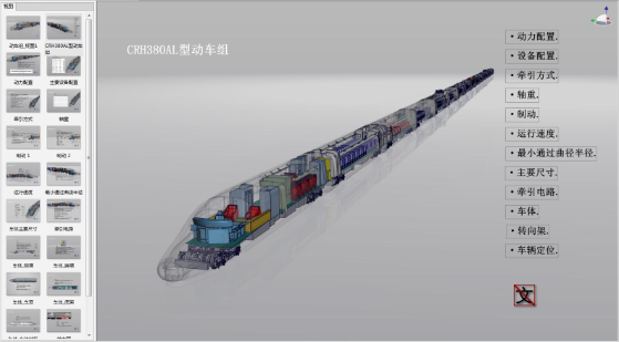 系统以实际运行的指定型号真实动车为原型,深入现场采集资料(拍摄照片、视频、动车组技术文档、参数等)制作,结合现场司机、机械师等实际经验。可实现受训人员的CRH基础操作训练,包括:①产品或设备的简易操作过程仿真;②产品或设备的检修工艺流程与控制仿真;③产品或设备的故障与处理流程仿真。