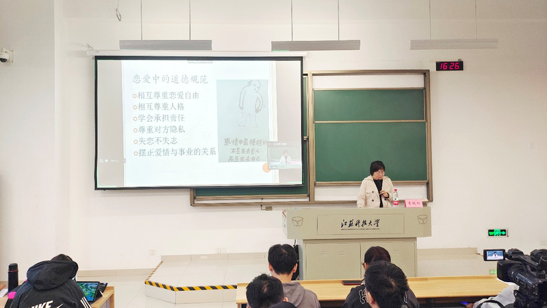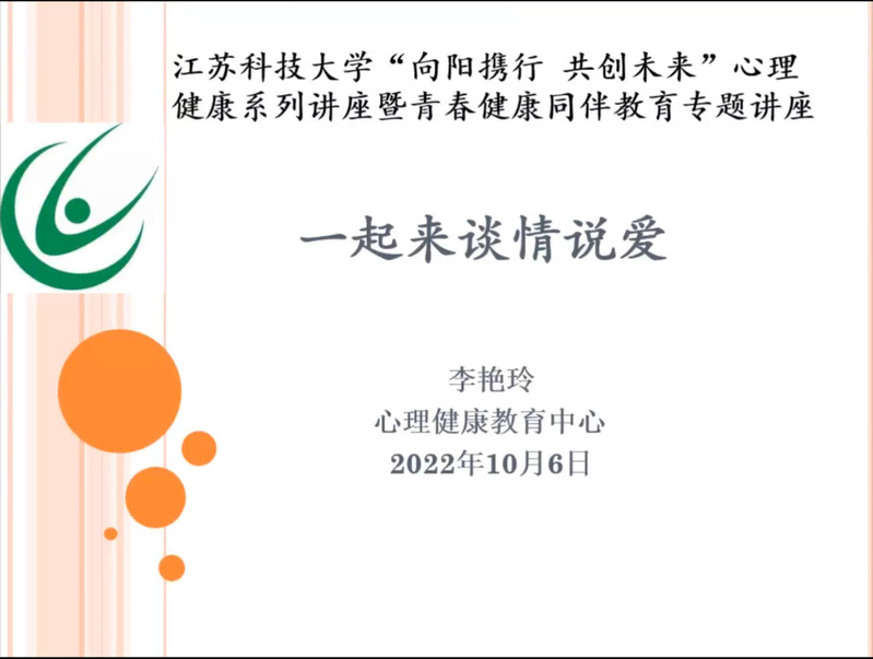 10月6日下午15:30,由江苏科技大学心理健康教育中心、拼搏在线平台_拼搏(中国),主办的“向阳携行,共创未来”心理健康教育系列讲座在笃学楼108教室顺利开展。本次讲座通过线上线下相结合的形式,邀请校心理健康教育中心专职教师李艳玲老师进行《略谈大学生情感》主题宣讲,旨在帮助学生明确恋爱观,普及性爱安全知识。会议由计算机学院心理辅导员刘宝达老师主持,各班级同学近200人参加。