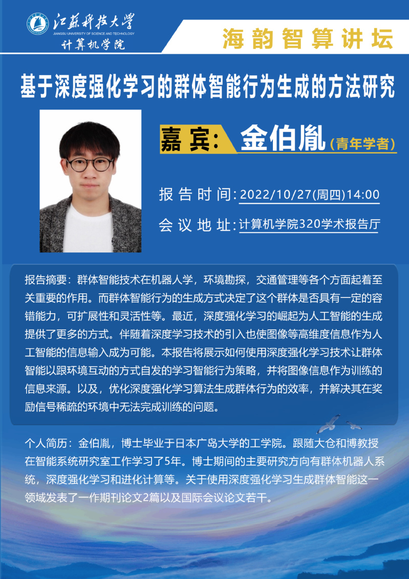 海韵智算讲坛:(金伯胤)基于深度强化学习的群体智能行为生成的方法研究