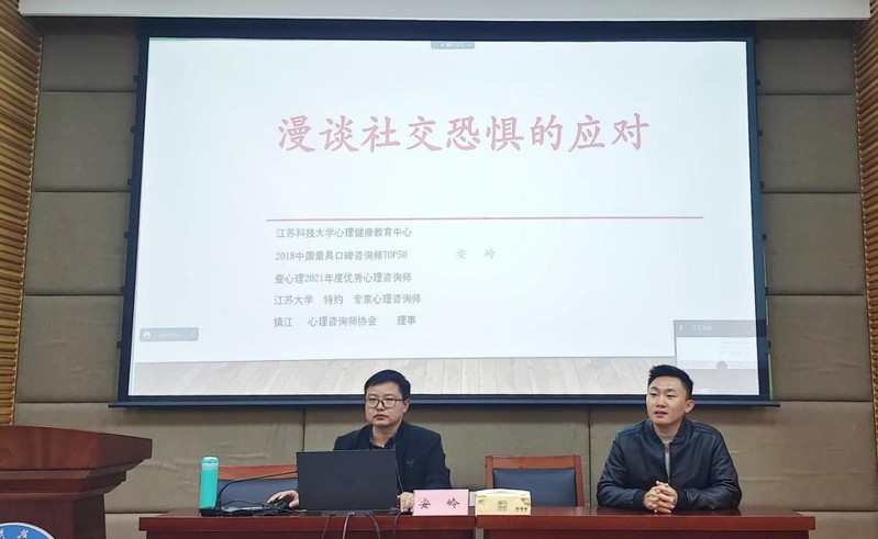 11月4日下午15:30,江苏科技大学心理健康教育中心、拼搏在线平台_拼搏(中国),“心理健康辅导工作室”在图书馆B101开展“向阳携行,共创未来”心理健康教育讲座。本次讲座通过“线上+线下”双平台,邀请校心理健康教育中心专职教师安玲老师进行《漫谈社交恐惧症的应对》主题宣讲,旨在帮助同学们认识到什么是社交恐惧症,正确的认识社交恐惧症,帮助同学们战胜社交恐惧,消除社交紧张,建立良好的人际交往。会议由计算机学院心理辅导员刘宝达老师主持,学院各专业各班级同学近100人参与。会议开始由刘宝达老师简述本次的讲座内容,并且隆重的介绍本次的主讲人安玲老师,大家对安玲老师表示热烈的欢迎。