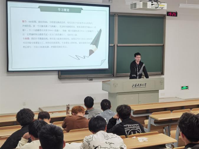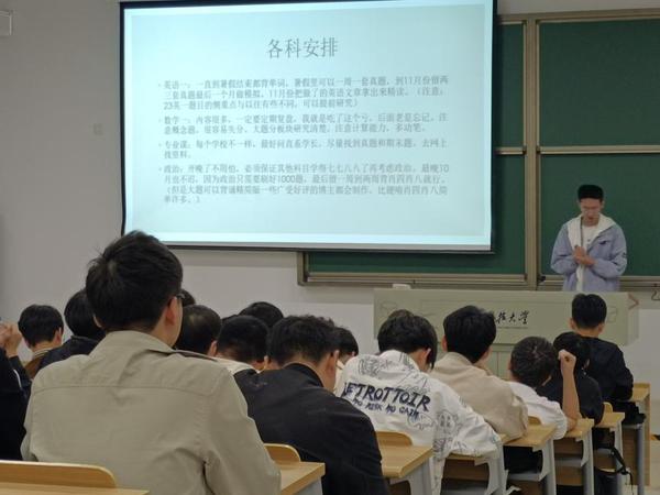 刘林松,拟录取于西安电子科技大学攻读人工智能专业学硕学位。刘林松主要是从各科安排和心态两个方面分享经验尤其注重心态问题,在他的激励的话语中,在场同学斗志昂扬,可谓少年自有凌云志,不负黄河万古流。