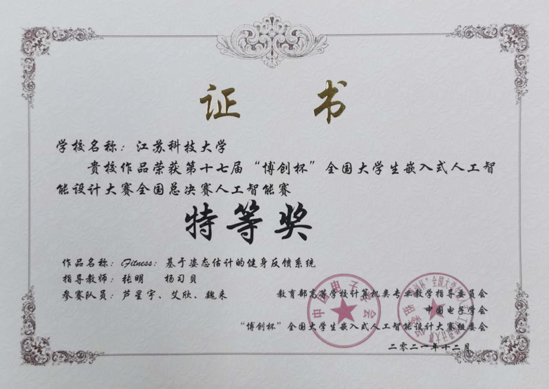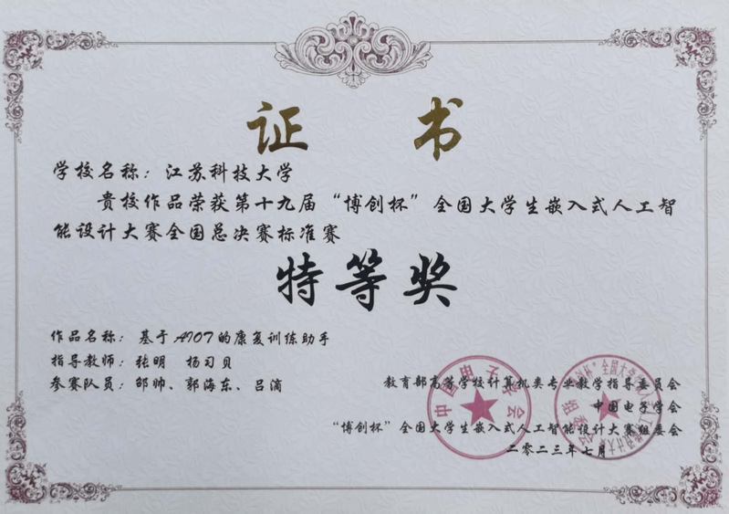 计算机学院移动应用创新实验室近年来围绕嵌入式人工智能设计开发、康复训练、物联网人工智能算法、物联网平台、生物信息学等展开了一系列卓有成效的研究。同时实验室注重产学研一体化,积极推动产学研紧密结合,与企业、康复医院、社区等开展了一系列合作研究。为培养德智体美劳全面发展、具有运用信息技术解决实际问题的综合创造能力的学生提供了实践创新平台。2021年由张明、杨习贝老师指导,芦星宇等同学完成的《基于姿态估计的健身反馈系统》获得全国总决赛人工智能赛特等奖。2022年由张明、张静老师指导,姜风超等同学完成的《嵌入式加密通信系统的设计与实现》获得硕士组全国总决赛特等奖。2023年由张明、杨习贝老师指导,邵帅等同学完成的《基于AIOT的康复训练助手》获得全国总决赛标准赛特等奖。
