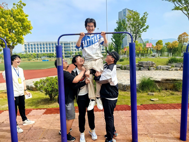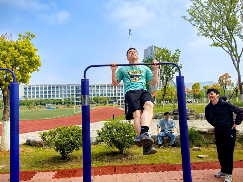 活动开始的命令一响起,各队伍迅速冲向操场健身器材处,团队为单位,共同挑战了引体向上的任务。通过队员之间的相互配合,同学们成功完成了五个标准的引体向上的任务,信心倍增。