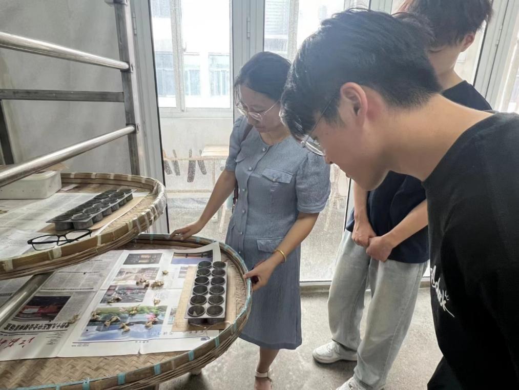 首先映入眼帘的是那一群刚刚孵化出来、形如蚂蚁般的蚁蚕。团队成员们非常惊讶,表示还从没见过这种形态的蚕。它们身体黑亮,细小而脆弱,正聚集在桑叶上。老师向队员们介绍道:“这就是蚕的生命起点,虽然看似不起眼,却蕴藏着无限的可能。”在这一刻,成员们成为了生命起始的最好见证者。