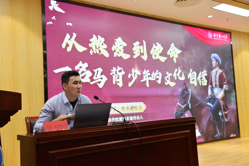 唐宝・吐尔逊哈力来自南京理工大学设计艺术与传媒学院,他有着多重身份:哈萨克族传统服饰非遗传承人、退役军人以及全球可持续发展杰出青年艺术家。他以自己的亲身经历,为大家讲述了一个个生动的故事,深刻阐释了中华民族共同体意识的内涵。