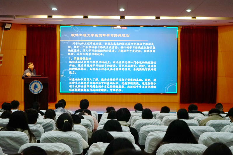 为帮助大一新生深入了解软件工程专业特点与发展方向,规划未来的学习与职业道路,计算机学院于1128日晚19:00,在梦溪校区学术报告厅举办了2024级新生转型教育课。学院软件工程专业负责人束鑫老师以及软件协会会长凌睿祥同学受邀担任主讲人,吸引了众多师生积极参与。2024级软件工程、人工智能专业的学生齐聚一堂,全神贯注地聆听讲座,计算机类专业的学生也通过网络直播同步参与,全体新生辅导员共同出席。活动由学院负责新生转型教育课的辅导员张威老师主持。