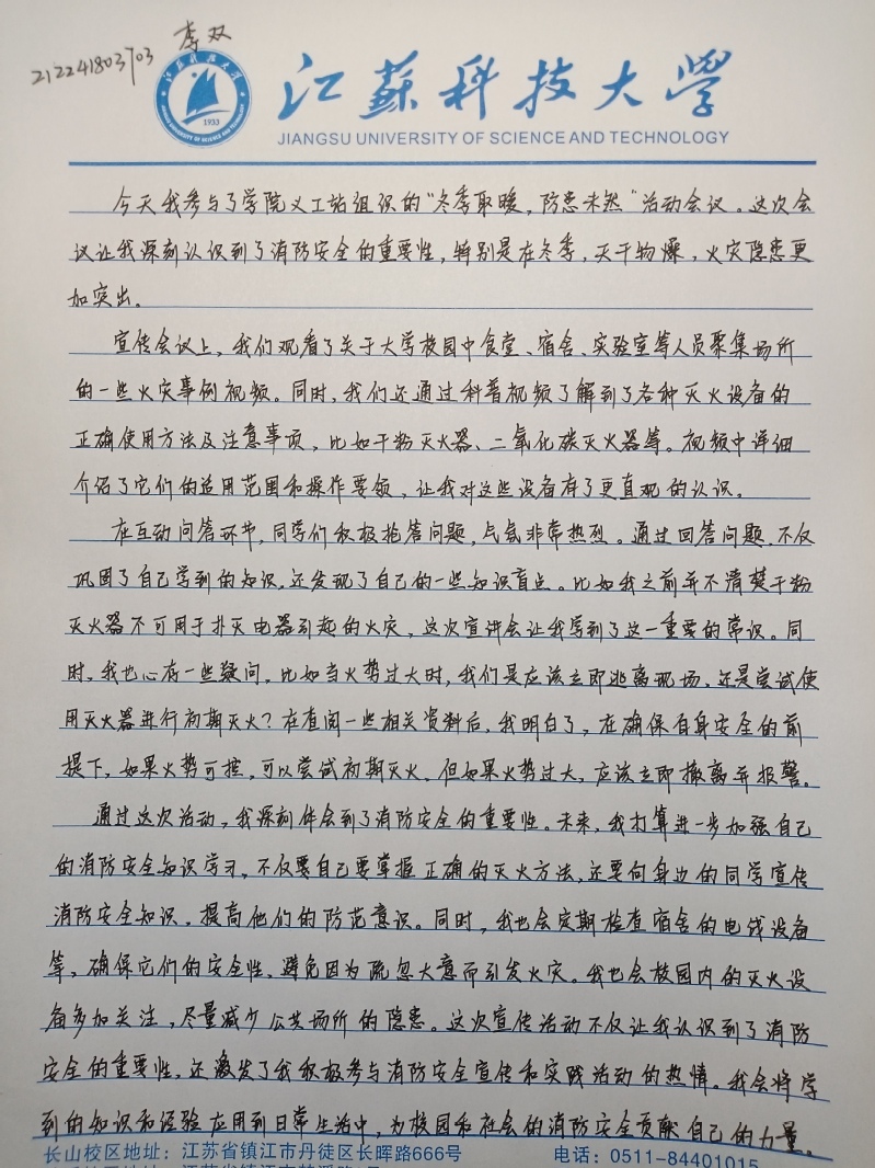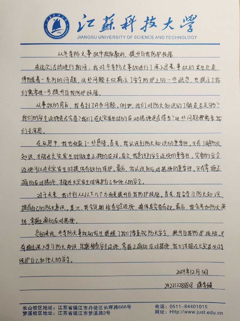 “平安在心” 活动则让学生们在宣讲会结束后,静下心来,认真反思和总结。大家纷纷撰写心得体会,分享自己在活动中的收获感悟。有的同学表示,通过这次活动,才意识到身边原来存在这么多消防隐患,以后一定会更加注意用火用电安全。还有的表示,在今后会注重学习消防安全知识的教育,培养安全意识和自我保护能力。