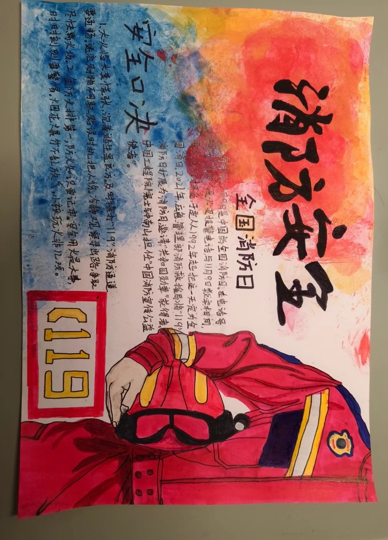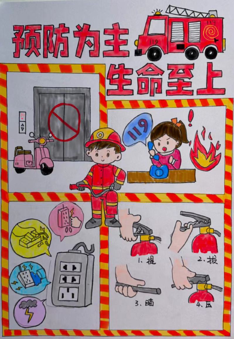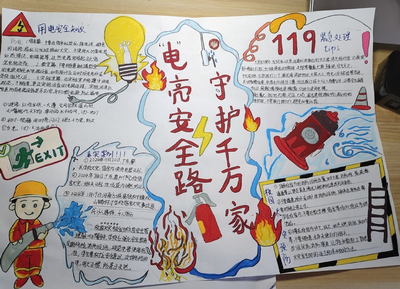在“暖冬绘心” 活动中,同学们充分发挥自己的想象力和创造力,以纸张为主要载体,绘制出了一幅幅精美的绘画作品。这些作品内容丰富多样,有的用鲜艳的色彩和生动的形象展示了火灾预防的小贴士,如定不在楼道停车、不超负荷用电等;有的则通过漫画的形式,描绘了正确操作灭火器的方法;还有的分享了一些令人警醒的真实火灾案例,让人们深刻感受到火灾的可怕。此外,不少作品中还加入了有趣安全口诀等元素,进一步加深了大家用火用电的安全意识。