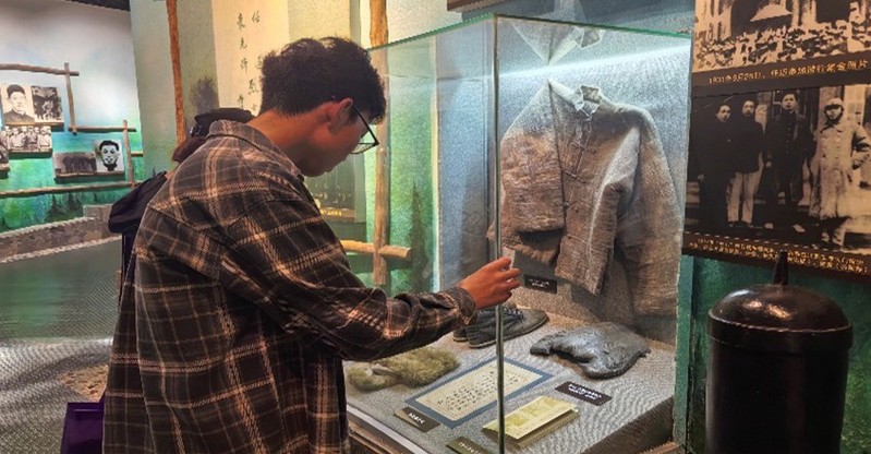 另外,同学们还参观了李培根烈士的粗布棉袄和牛皮腰带。这些褪色磨损的遗物,记录着他在严冬开展地下工作的艰辛。棉袄内的暗层和腰带的磨损,无声诉说着革命岁月的惊险。同学们通过这些展品,深刻感受到先烈的坚定信念和奋斗精神。