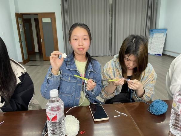 活动现场气氛温馨而活跃,舒缓音乐萦绕,同学们手中的钩针在柔软毛线间穿梭,专注的神情构成了一幅美好画面。有的同学凭借出色天赋,迅速掌握钩织技巧,成品接连不断,展现出非凡的动手能力;有的同学则在传统钩织基础上加入独特创意,如添加个性化配饰、设计特别针法,让作品独具魅力;还有一些同学虽起步较慢,但全程专注认真,一针一线都倾注了心血,完成作品时满溢的成就感感染了在场每一个人。即便有部分同学未能在活动中完成作品,可他们也在编织过程中享受到了内心的宁静与放松。