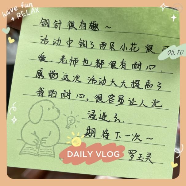 活动结束后,同学们纷纷写下心得体会。有同学感慨:“原本只是抱着尝试的心态来参加,没想到在钩织的过程中,感觉时间都慢了下来,心里的焦虑也被抚平,特别治愈。”也有同学表示:“和大家一起钩织,互相交流、互相帮助,不仅收获了新技能,还感受到了活动的温暖,期待下次还能参加这样的活动。”这些文字,字里行间都流露出对活动的喜爱与认可。