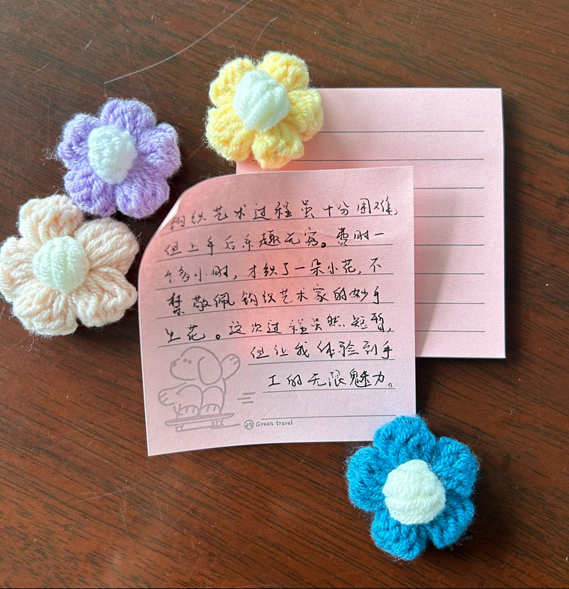 活动结束后,同学们纷纷写下感悟。有人表示:“钩织让我暂时忘却了学业压力,很解压。”也有人感叹:“虽然上手有些困难,但完成作品时的喜悦让人难忘。”这些真挚的文字,展现了活动对同学们心灵的抚慰与激励。