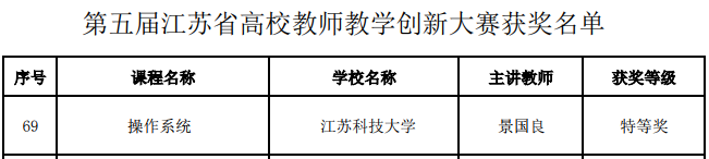 近日,第五届江苏省高校教师教学创新大赛决赛在江苏大学圆满落幕,经过激烈角逐,来自我院的景国良老师凭借其独特的教学理念、创新的教学方法和显著的教学成效,参赛课程《操作系统》受到了评审专家的高度认可,最终赢得新工科副高组特等奖桂冠,并且排名该组别全省第一,充分展现了我院在教学改革与创新方面的突出成果。
