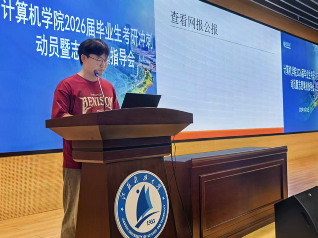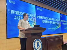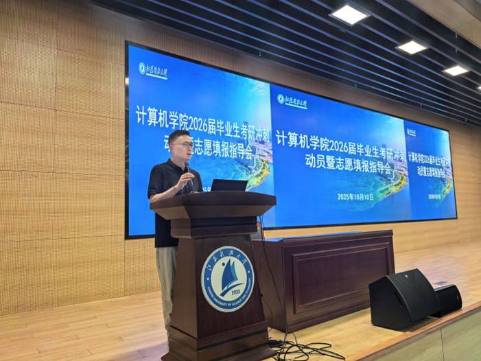 为帮助2026届考研学生深入了解考研政策与形势,科学规划报考目标,增强备考信心,计算机学院于10月10日下午在长山校区图书馆B105召开“计算机学院2026届毕业生考研冲刺动员暨志愿填报指导会”。学院全体领导班子成员、各系主任、专业负责人、青年博士教师、毕业班班主任、辅导员及2026届考研学生共同参加。会议由学院党委副书记吴健康主持。