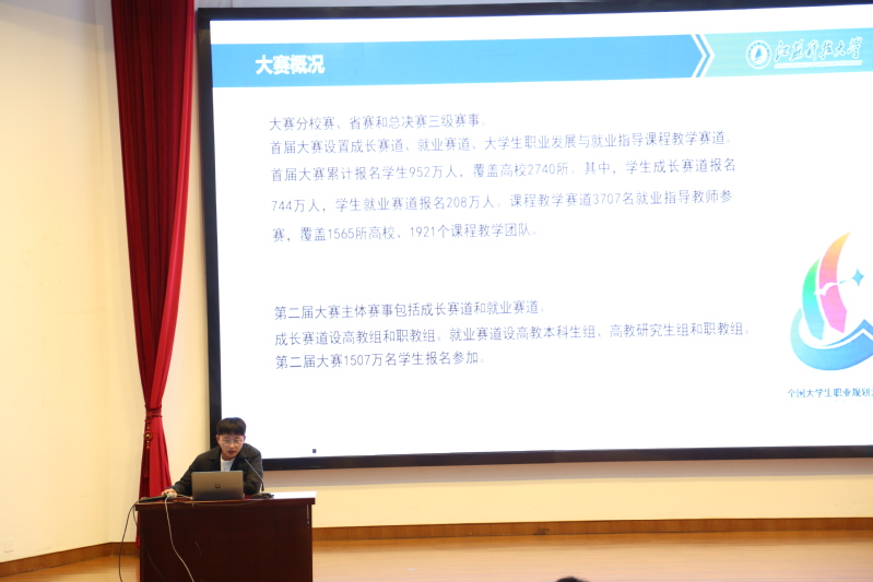 讲座中,陆鑫老师围绕大赛主题“筑梦青春志在四方,规划启航职引未来”,详细介绍了赛事背景、三级赛事体系及成长赛道、就业赛道的分组规则与核心要求。结合大赛“以赛促学、以赛促教、以赛促就”的目标,他拆解了不同赛道的参赛材料规范、评审标准与备赛逻辑,重点讲解职业目标设定、行业信息搜集、实践经历梳理等关键备赛环节。针对新生特点,陆鑫老师分享了职业规划的科学方法,包括自我认知、职业探索、路径规划等核心内容,介绍了权威行业信息平台与生涯人物访谈技巧。同时,他结合AI赋能备赛的思路,强调作品真实性的重要性,指导新生合理运用工具提升作品质量,避免常见备赛误区。